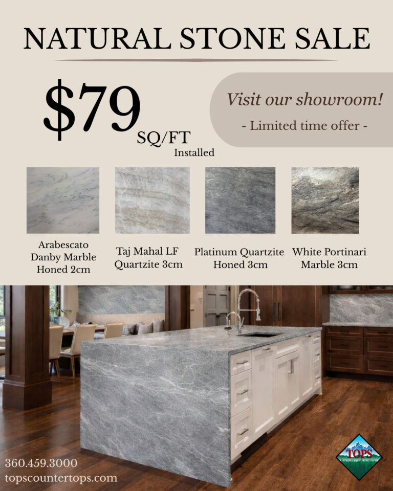 Check out our high-end single granite slabs for only $50/sq. ft. near Lacey, WA! This includes stunning options like the 3cm Grey Nuevo granite, perfect for vanities, bar tops, or outdoor kitchen settings. These deeply discounted granite slabs are priced to sell quickly at TOPS Countertops. Call us today to reserve your single slab while supplies last!