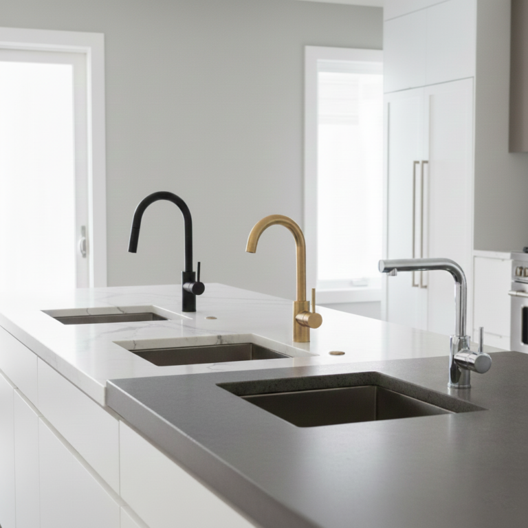 Will a matte black faucet look too bold with my light countertop? Does a sleek pull-down faucet fit my kitchen design, or should I choose a single-handle model? Which faucet finish actually stays clean in a modern kitchen? These are the questions homeowners bring into our showroom as they pair faucets with new stone and engineered countertops.